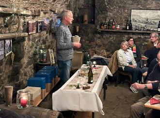 Im authentischen Weinkeller von ca. 1750 fand auch in diesem Jahr die historische Weinprobe statt. Winzer Oliver Krupp, Bruchhausen zeigte sich ausgesprochen angetan vom Ambiente des Gewölbekellers und erzählte „von weiß nach rot“ sehr anschaulich über die Weinherstellung, wobei er sich immer wieder der ausgestellten alten Winzergeräte bediente.