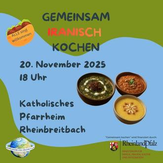 Gemeinsam für Vielfalt e. V. (GfV) lädt am 20. November um 18:00 Uhr im Rahmen der Veranstaltungsreihe „Gemeinsam kochen“ ins katholische Pfarrheim Rheinbreitbach ein. Wie immer bei der monatlich stattfindenden Veranstaltungsreihe geht es darum, zusammen ein vielfältiges Menü vorzubereiten und sich dabei kennenzulernen und auszutauschen. Dieses Mal werden die Teilnehmenden drei iranische Gerichte unter erfahrener Leitung zusammen kochen. Die Teilnehmenden können sich auf besondere Gaumenfreuden und Geschmackserlebnisse freuen. Vorkenntnis ist nicht nötig und es muss nichts mitgebracht werden, außer Neugierde, Spaß und Appetit.