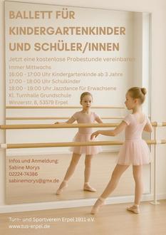 Elegant stehen, spielerisch tanzen, Musik erleben: Der Turn- und Sportverein Erpel 1911 e.V. bietet ein Ballettangebot für Kindergartenkinder ab 4 Jahren sowie Schulkinder an. Interessierte Familien können ab sofort eine kostenlose Probestunde vereinbaren.