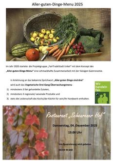 Wir starten in eine neue Runde von Fairen Menus bei unseren Unkeler Gastronomen unter dem Motto „Aller guten Dinge“. Am 04.12.2025 um 19:00 Uhr sind alle Liebhaber von ausgewähltem Essen mit regionalen und fair gehandelten Zutaten eingeladen, im Scheurener Hof zu einem Fairen Menu zu kommen.