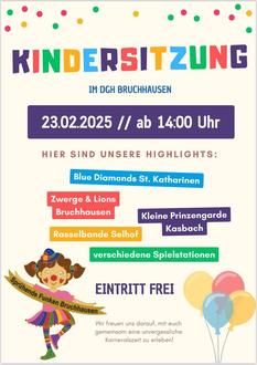 Wie gewohnt heißen die Sprühenden Funken auch dieses Jahr wieder alle Kinder mit ihren Familien zur Kindersitzung in Bruchhausen willkommen.