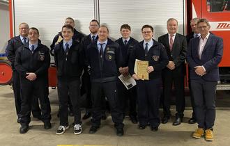 Mit dem „Bronzenen Feuerwehrehrenzeichen“ für 15-jährige aktive, pflichtgetreue Tätigkeit bei der Feuerwehr wurden Stephan Homey und Jan Niklas Zagermann geehrt.