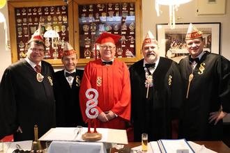 Das Hohe Gericht tagte traditionell im Verhaftungslokal „Om Maat“. Richter Dieter Beschoner leitete mit närrischer Strenge die Verhandlungen. Unterstützt wurde er von den Staatsanwälten Uwe Kochems und Andreas Schwager sowie Verteidiger Jörg Buchmüller. Der Saal war bestens gefüllt, die Stimmung hervorragend und die Wortgefechte sorgten für viele Lacher.