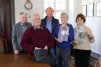 Ein bewegender Moment im Ratssaal des Erpeler Rathauses: Karl Feldens (vorne) hält das Tagebuch und die durchschossene Brieftasche seines Großvaters Wilhelm „Willi“ Feldens. Hinter ihm (v. l.) Edgar Neustein, Günter Hirzmann, Verena Geraets mit einem Porträt von Willi Feldens sowie Clarissa Wild mit einem Bild von Maria Feldens.