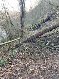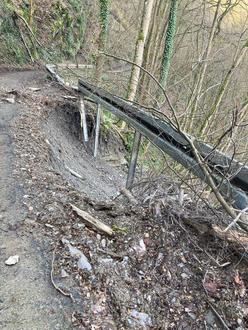 Mehrere Sturmereignisse haben dazu geführt, dass Bäume oberhalb des Weges auf den Weg gestürzt sind. Dabei wurden zum Teil erhebliche Schäden an Absturzsicherungen bzw. Leitplanken verursacht.