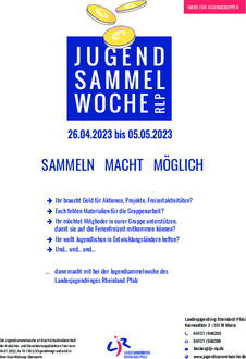 Nach drei Jahren Pandemie bleibt es für Jugendgruppen nach wie vor schwierig für die eigenen Aktivitäten und für Projekte ausreichend Gelder zusammen zu bekommen. Die Jugendsammelwoche zwischen dem 26. April und dem 05. Mai 2023 bietet eine großartige Möglichkeit geplante Projekte umsetzen zu können. Denn, trotz der aktuellen Mehrkosten in den Bereichen der Energie und der Verbrauchsgüter, wird Jugendarbeit überall in Rheinland-Pfalz durch ehrenamtliche Tätigkeit getragen und organisiert.