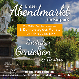 Ab dem 2. Mai findet der „Emser Abendmarkt“ erstmalig im Kurpark -zwischen dem Kaiser-Wilhelm-Denkmal und der Spielbank- statt. Der Abendmarkt wird künftig jeden ersten Donnerstag des Monats (von Mai - Oktober) zwischen 17 und 22 Uhr mit einem hochwertigen Angebot in entspannter Kurpark-Atmosphäre für Besucher und Anwohner zu einem neuen attraktiven Anlaufpunkt werden. Bei der Pressekonferenz am 1. März 2024 erläuterten Stadtbürgermeister Oliver Krügel, Marketingexperte Prof. Harald Ross, Kerstin Fuchs (Marktmeisterin & Assistentin von Herrn Krügel) und Nicole Zins von der Verbandsgemeindeverwaltung das Projekt.