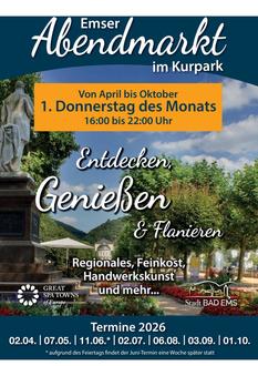 Auch in diesem Jahr lädt die Stadt Bad Ems herzlich zum „Entdecken, genießen und flanieren“ in den Kurpark ein.