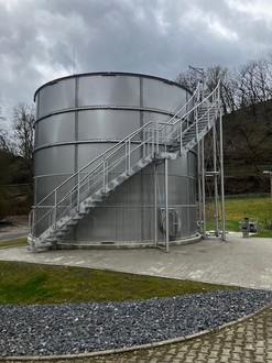 Der oberirdisch aufgestellte Rundbehälter aus Edelstahl hat einen Durchmesser von 7,10 Metern und eine Höhe von 6,00 Metern. Eine außenliegende Manteltreppe mit Zwischen- und Bedienpodesten ermöglicht den sicheren Zugang, ein Rührwerk sorgt für die gleichmäßige Durchmischung im Speicher. Über einen Fertigteilschacht mit Durchflussmessung und Regelschieber wird das bei der Schlammentwässerung anfallende Filtratwasser dem Belebungsbecken nach und nach zudosiert, um eine Überlastung der biologischen Anlagenstufe zu vermeiden.
