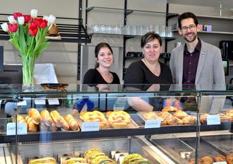 Stadtbürgermeister Manuel Liguori (rechts) gratulierte der Konditormeisterin Olga Sotnikov (Mitte) zur Café-Neueröffnung. Mit auf dem Foto Mitarbeiterin Katharina Pfaff (links).