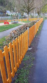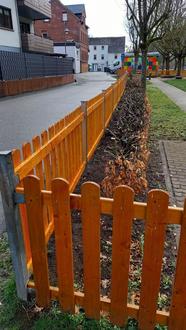 Im Zuge der Maßnahme, bei der zum Teil auch erst aufwendig das Wurzelwerk der Hecke entfernt werden musste, konnten Mitglieder des Heimat-und Verkehrsvereins mit Unterstützung der Gruppe „Heckebock-First“ jetzt auch die restlichen Teile des neuen und vom Verein komplett finanzierten Schutzzaunes am Kinderspielplatz an der Lahn anbringen.