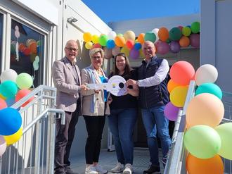 Strahlende Gesichter bei der Einweihung der neuen Containeranlage in Geisig. Von links nach rechts: Erster Beigeordneter Lutz Zaun, Sonja Meffert (Planungsbüro Meffert), Linda Stein (Leitung), Thomas Heymann (Ortsbürgermeister Geisig)