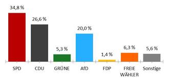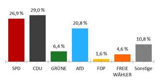 Von den insgesamt 13.413 gültig abgegebenen Zweitstimmen entfielen auf die SPD 3.608 Stimmen oder 26,9 % auf die CDU 3.888 oder 29 %. 860 Wahlberechtigte kreuzten die Grünen an. Dies entspricht 6,4%. Die AfD erlangte 2.784 Stimmen oder 20,8%. Für die FDP votierten 1,6 % oder 213 Wähler und für die Freien Wähler 4,6 % oder 616 Stimmen. Die Linke erhielten 624 Stimmen oder 4,7 %. Das Ergebnis der weiteren 5 Parteien lag zusammen bei 6,1 %.
