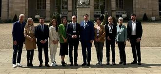 Die Frauen und Herren vertretenden (Ober-) Bürgermeister der Great Spa Towns, (v.l.) Dietmar Späth (OB Bad Kissingen), Lenka Prusova (BM Franzensbad), Oliver Krügel (SBM Bad Ems), Andrea Pfeffer-Ferklova (OB Karlsbad), Dr. Dirk Vogel (OB Bad Kissingen), Stefan Szirucek (BM Baden bei Wien), Sophie Delettre (BM Spa), Yves-Jean Bignon (Beigeordneter Vichy), Ruth Malloy (Councillor Bath). Es fehlt Luca Baroncini (BM Montecatini Terme).