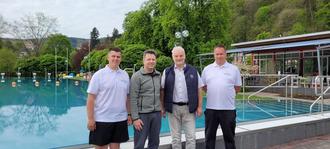 Als eines der ersten in der Region hat das Nassauer Freibad am 1. Mai die Saison eröffnet. Das Team um Schwimmmeister Christian Meinecke (rechts) begrüßte mit dem Beigeordneten der VG Bad Ems - Nassau, Birk Utermark (2. von rechts) die ersten Schwimmer.