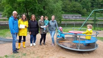 Und so kam es, dass dem Ortsbürgermeister diese großartige Spende bei einem Treff einiger Krabbelgruppenmütter (einschl. einzelnen ZwergenJ) auf dem Spielplatz in den Lahnanlagen übergeben wurde. Und zwar an jenem Karussell, dessen neueres Modell in Kürze auch seinen Platz auf dem Spielplatz im Oberdorf finden wird. Das neue Spielgerät ist da und die Vorbereitungen schon getroffen. Leider ließ das unstete Wetter in der letzten Zeit noch nicht zu, dass es installiert werden konnte. Die Vorgaben für den Aufbau und das Fundament verlangen eine längere Trockenphase von ein paar Tagen. Wir hoffen aber, dass dies in Kürze und vielleicht mit tatkräftiger Unterstützung einiger Krabbelgruppenväter in die Tat umgesetzt werden kann.