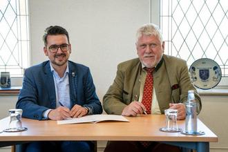 Stadtbürgermeister Oliver Krügel und Geschäftsführer der RuheForst GmbH Jost Arnold unterzeichnen den Vertrag zur Weiterführung des Kaiserwaldes