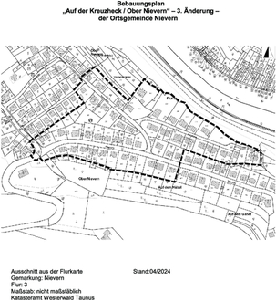 Aufgrund der §§ 2 ff. Baugesetzbuch (BauGB) in der Fassung der Bekanntmachung vom 03.11.2017 (BGBl. I S. 3634), in der zurzeit geltenden Fassung, hat der Rat der Ortsgemeinde Nievern in seiner Sitzung am 14.05.2024 die Eröffnung des Verfahrens / Aufstellungsbeschluss zur 3. Änderung des Bebauungsplanes „Auf der Kreuzwiese / Ober Nievern" beschlossen.