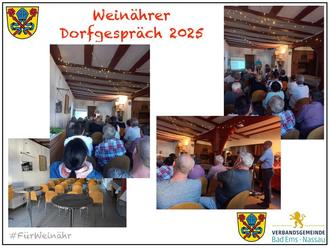 Am 13. Mai 2025 fand im historischen Rathaus das erste Dorfgespräch unter der Leitung von Ortsbürgermeister Florian Schliemann statt. Rund 40 Bürgerinnen und Bürger - darunter Gemeinderatsmitglieder und Verbandsgemeindebürgermeister Uwe Bruchhäuser - füllten den Saal und zeigten großes Interesse an den Themen der Ortsgemeinde.