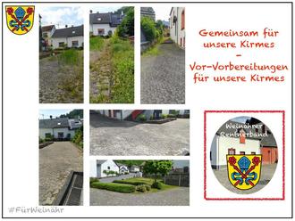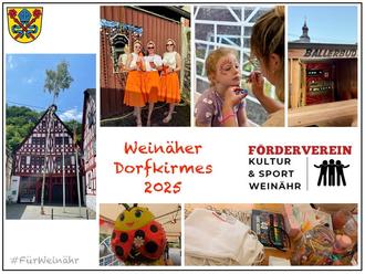 Die Dorfkirmes beginnt freitagabends immer mit dem traditionellen Kirmesbaumstellen, bei dem der TuS Weinähr und die freiwillige Feuerwehr Weinähr seit Jahrzehnten Hand in Hand zusammenarbeiten. Vielleicht etwas krummer als sonst, steht der Kirmesbaum in seiner vollen Pracht - auch die nächsten Tage noch - vor dem Rathaus.