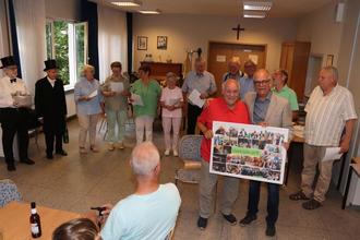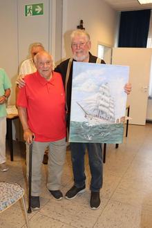 Im Nieverner Pfarrheim trafen sich dann viele seiner Freunde von früher und auch von heute, mit denen er über alle Jahre einen regen Austausch geführt hatte. Vieles gab es zu erzählen aus dem schier unerschöpflichen Erinnerungsschatz von Jochen Wehde. Manche Anekdote trieb den Gästen die Lachtränen in die Augen. Die kamen dem Jubilar spätestens dann, als ihm von allen eine von Heimatfotograf Jürgen Jachtenfuchs gestaltete Bildtafel persönlicher Erlebnisse überreicht wurde, untermalt von einigen Geburtstagsliedern, vorgetragen vom von Gerd Gilles eigens für diesen Anlass gegründeten „Jochen-Chor“. Als Heinz-Georg Crezelius und Werner Kicker - - wie vor 5 Jahren versprochen – mit Frack und Zylinder auftauchten und Werner Stocker seinem alten Freund ein selbstgemaltes Portrait der Gorch Fock übergab, war es gänzlich um ihn geschehen und der „Glückstädter Heckebock“ konnte sein Glück kaum fassen.