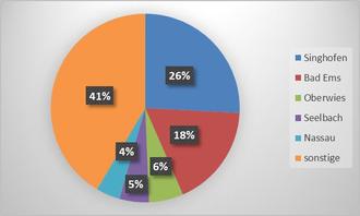 Strom zu nennen. 26 % des in der Verbandsgemeinde Bad Ems-Nassau mittels Photovoltaik erzeugten Stroms kommt damit aus der Ortsgemeinde Singhofen. Es folgen die Stadt Bad Ems mit einem Anteil von 18 %, die Ortsgemeinde Oberwies mit 6 %, die Ortsgemeinde Seelbach mit 5 % und die Stadt Nassau mit einem Anteil von 4 % an der absolut erzeugten Strommenge mittels Photovoltaik.