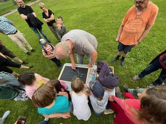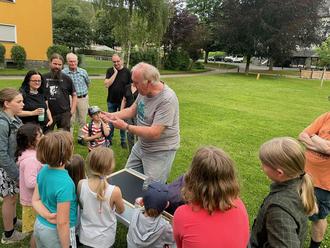 Mittels unterschiedlichster Anschauungsmaterialien wurde auf dem Campus der Stiftung Scheuern, in die Ziele der abendlichen Exkursion, die gut besucht war, eingeführt. Glühwürmchen, der Hirschkäfer als unser größter Käfer und Fledermäuse sollten im Focus stehen.