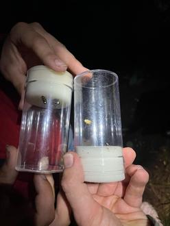 Dann plötzlich, ein „da-da“ ging durch die Runde: der Erste Leuchtkäfer schwebte über einem dunklen Felsen am Ende des Philosophenweges. Weitere Exemplare gesellten sich dazu. An der Grillhütte angekommen, die Dunkelheit hatte sich noch gesteigert, weitere Leuchtkäfer, alles fliegende Männchen. Kurz nach der Grillhütte ein auffallend helles Licht vom Boden: die Ehefrau von Stadtbürgermeister Manuel Liguori hatte ein Leuchtkäferweibchen gefunden, barg es vorsichtig und steckte es in ein Sammelglas. Daneben im anderen Glas die geflügelten kleineren Männchen, die nebeneinander gut beobachtet werden konnten und mit effektiver Energieausnutzung weiter leuchteten. Alle Tiere wurden wieder vor Ort ausgesetzt. Leuchtkäferweibchen sind viel seltener als die fliegenden Männchen. Noch bis zum Eisweiher gab es vereinzelt Leuchtkäfer zu sehen. Das laute Konzert der Seefrösche wurde von einem ebenso lauten „ku-wick“ eines Waldkauzweibchens unterbrochen.