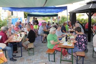 Bei herrlichem Wetter und kühlen Getränken präsentierte er auf einer Großleinwand verschiedene fotografische Momentaufnahmen. Ob beim Personenraten mit „Dalli-Klick“, einer zusammenfassenden Dokumentation seines Wirkens aus den letzten 40 Jahren oder mit der eigens für diese Jubiläumsfeier zusammengestellten Präsentation „Menschen in Nievern“: die Besucher konnten sich anhand von über 650 Fotos einen Eindruck über das Leben und Wirken der Menschen in der Gemeinde und deren dörflichen Alltag verschaffen. Mit Gebhard Linscheid aus Winden, Heinz Ott aus Frücht und Franz Lehmler aus Nievern, gaben auch aktive und ehemalige Ortsbürgermeister aus Gemeinden einen kleinen Überblick, was die Aktivitäten von Foto Jachtenfuchs in ihren Gemeinden verändert oder angeregt hatten. Alle hoben die Herausgabe des jährlich angebotenen Heimatkalenders in den jeweiligen Gemeinden hervor und lobten die damit verbundene Archivierung von Zeitaufnahmen und die Sammlung von zahlreichen neuen Motiven für den Ort. Auch der von Bäckermeister Heiner Walldorf neu kreierte „Fährplanken“ von Nievern, wurde - ähnlich wie der „Heckebock“ im Jahre 2000 zur 725-jährigen Jubiläumsfeier - vorgestellt. Nun wird die Gemeinde im Jahre 2025 750 Jahre alt und der Verkauf dieses herzhaften Gebäcks soll mit dazu beitragen einen entsprechenden finanziellen Grundbetrag zu sammeln, dessen Erlös dann im Jubiläumsjahr allen Nieverner Bürgern zu Gute kommen soll.