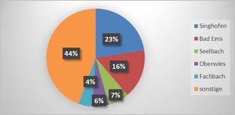 Mit Blick auf die absoluten Zahlen im Jahr 2022 sind die in der Gemeinde Singhofen und der Stadt Bad Ems aufgestellten Photovoltaikanlagen mit ca. 1,6 Millionen kWh bzw. 1,2 Millionen kWh erneut als Spitzenreiter bei der erzeugten Menge Strom zu nennen. 23 % des in der Verbandsgemeinde Bad Ems-Nassau mittels Photovoltaik erzeugten Stroms kommt damit aus der Ortsgemeinde Singhofen. Es folgen die Stadt Bad Ems mit einem Anteil von 16 %, die Ortsgemeinde Seelbach mit 7 %, die Ortsgemeinde Oberwies mit 6 % und die Ortsgemeinde Fachbach mit einem Anteil von 4 % an der absolut erzeugten Strommenge mittels Photovoltaik. Oberwies und Seelbach haben im Vergleich zum Jahr 2020 ihre Plätze eingetauscht und die Stadt Nassau ist auf dem fünften Platz durch die Ortsgemeinde Fachbach abgelöst worden.