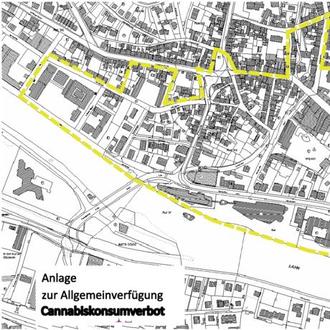 | Der räumliche Geltungsbereich der Allgemeinverfügung kann dem beigefügten Kartenausschnitt (Anlage zur Allgemeinverfügung Cannabiskonsumverbot) entnommen werden. Dieser ist Bestandteil der Allgemeinverfügung. |