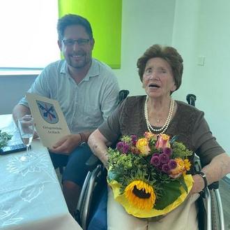 Der Erste Beigeordnete Christian Christ besuchte die Jubilarin im St. Josefsheim und freute sich bei einem Plausch und kühlem Gläschen Sekt herzliche Glückwünsche zu überbringen.