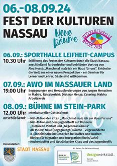 Vom 06. bis 08. September 2024 lädt die Stadt Nassau herzlich zum "Fest der Kulturen" ein. Diese dreitägige Veranstaltung verspricht ein buntes und vielfältiges Programm, das alle Altersgruppen begeistern wird.
