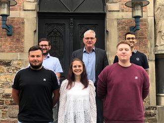 Hintere Reihe v.l.n.r.: Michael Lempka (Personaleiter), Bürgermeister Uwe Bruchhäuser, Felix Gutfrucht (Ausbildungsleiter) Vordere Reihe v.l.n.r.: Marius Siekmann, Luisa Lenz und Felix Blankenberg