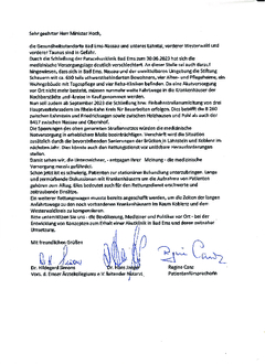 In einem offenen Brief richten sich Dr. Hildegard Simons, Vorsitzende des Emser Ärztekollegiums e.V., Dr. Hans Jaeger, leitender Notarzt und Regine Canz, Patientenfürsprecherin an Gesundheitsminister Clemens Hoch zur Erhaltung des stationären Gesundheitsstandortes in Bad Ems. Der Brief ist nachfolgend abgedruckt:
