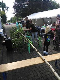 Nachdem dann jeder die Dinge, die seinem Herzen Freude machen, auf einem ‚Bierdeckel‘ notiert hatte, wurden diese am Kirmesbaum befestigt und der Baum dann von starken Männern aufgestellt. Während sich die Erwachsenen bei Kaffee und Kuchen und Leckerem vom Grill und angenehmen Gesprächen die Zeit vertreiben konnten, fanden die Kinder mit Kinderflohmarkt und der Ninja-Monster-Race-Hüpfburg XXL und anderen Spielen ihre Beschäftigung. Nach der Tombola mit super Preisen begann ab 20:00 Uhr das vielbeachtete Nagelturnier. Peter konnte den Wanderpokal in diesem Jahr nicht wieder verteidigen und wurde Dritter. Gewinner wurde Martin, Platz 2 sicherte sich Mathias. Im Festzelt hatten mittlerweile die drei Musiker der ‚Rock-Cover-Band ‚Buije‘ und ihr Tontechniker ihre Plätze eingenommen um uns mit ihren Klängen ganz toll musikalisch zu unterhalten; bei fortwährender Dauer immer besser unterstützt vom hochmotivierten Publikum, das mit vollem Elan mitging.