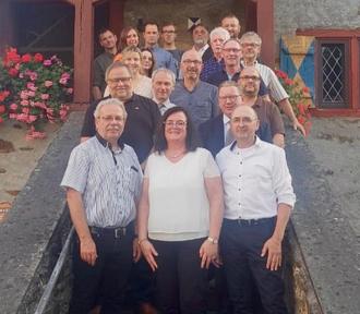 Die Mitglieder des neuen Rates von unten nach oben: Jochen Schneider, Michelle Wittler (Ortsbürgermeisterin), Reiner Sander, Armin Kraft, Jochen Standfuss, Adolph Fabricius (Fraktionssprecher CDU), Michael Linkenbach, Sarah Kirst, Rebecca Gasch, Heiko Wittler (Fraktionssprecher SPD), Walter Schwarz, Andreas Kaufmann. Frank Lanio, Andrew Marx, Kristina Wulfert, Mischa Ferdinand (Fraktionssprecher FWG), Christian Himmighofen, Klaus Ferdinand und Christian Linkenbach. Es fehlt Vincenzo di Canio.