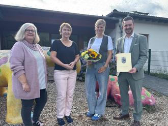 Carolin Mielke (2. von rechts) mit (v. l.) Barbara Böhnisch (Personalrat), Claudia Bruchhäuser (Einrichtungsleitung) und Stadtbürgermeister Oliver Krügel.