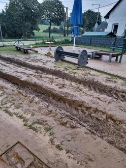 Das Außengelände der Kita Geisig, welches gerade neu fertiggestellt war, wurde stark in Mitleidenschaft gezogen. Die Wassermassen haben das gesamte Erdreich aufgewühlt und zu einem großen Teil weggespült, teilweise auch in den Eingangsbereich der Kita.