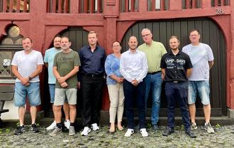Der neue Gemeinderat und Ortsbürgermeister mit VG-Bürgermeister Uwe Bruchhäuser: v.l.n.r. Frank Kreber, Benjamin Mono, Carsten Böhm, Bastian Salzwedel (2. Beigeordneter), Christian Wolf, Florian Schliemann (Ortsbürgermeister), Uwe Bruchhäuser, Jochen Fuchs (1. Beigeordneter), Volker Ludwig – es fehlt: Niklas Ramseger