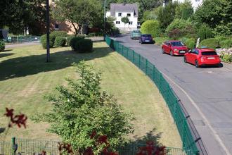 Die Mittelstraße in Nievern unmittelbar am Friedhofsgelände. Hier werden entlang der Zaunabtrennung nochmals über 35 Fotobanner gezeigt werden, die im Jubiläumsjahr mit über 700 Fotos gestaltet wurden. Auch die Aufnahme des „Jubiläums-Fotos“ ist am 18. Okt. 2025 in diesem Bereich geplant.
