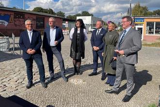 Teilnehmer der Feierlichkeiten: Bürgermeister Michael Schwuchow (l.), Bürgermeister Uwe Bruchhäuser (2. v.l.), Bürgermeister Antanas Kalnius mit Ehefrau Ruta (3.u.2. von rechts), Thomas Mottner (r.), Vorsitzender des Gemeinderates von Blankenfelde-Mahlow.