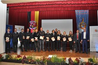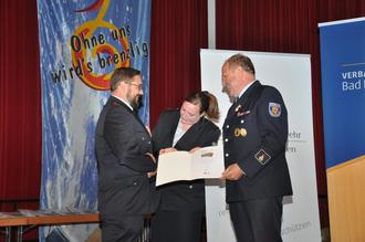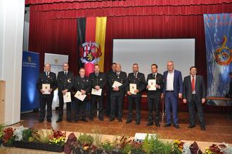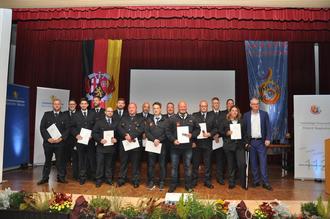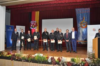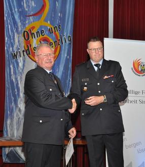 Zusammen mit Landrat Denninghoff überreichte er die Feuerwehr-Ehrenzeichen in Bronze und in Silber für 15-jährige bzw. 25-jährige aktive Tätigkeit, sowie Goldene Feuerwehr-Ehrenzeichen für 35-jährige und 45-jährige aktive Mitgliedschaft in der Feuerwehr.