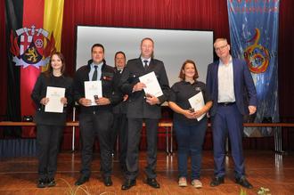 Nach den vielen Zahlen freute sich der Bürgermeister, zusammen mit dem Wehrleiter und den beiden stellvertretenden Wehrleitern Carsten Reifert und Karl Peter Salzmann, viele Verpflichtungen, Beförderungen und Ehrungen durchführen zu können. Den Anfang machten die neu zu verpflichtenden Kameradinnen und Kameraden.