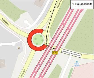 Den ersten Bauabschnitt bildet der Dreiviertelkreis Kölner Straße-Industriestraße-Kölner Straße- Hermsdorfer Straße. Während dieser Arbeiten ist nur die Fahrbeziehung von der der B 42 aus über die Kölner Straße in die Hermsdorfer Straße möglich. Alle anderen Fahrbeziehungen werden umgeleitet.