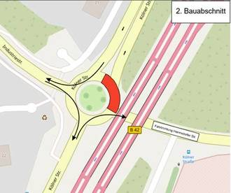 Den zweiten Bauabschnitt bildet der Viertelkreis Kölner Straße - Hermsdorfer Straße. Während dieser Arbeiten sind die Fahrbeziehungen zwischen der B 42 über die Kölner Straße bis in die Hermsdorfer Straße möglich. Lediglich alle Fahrbeziehungen von der Hermsdorfer Straße aus sind durch die Baustelle abgetrennt.