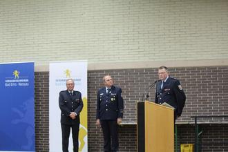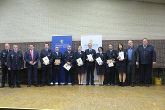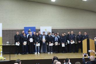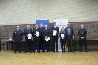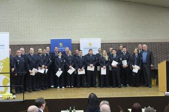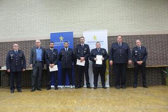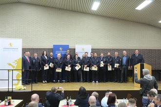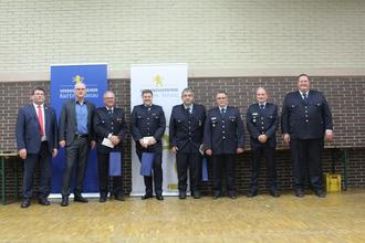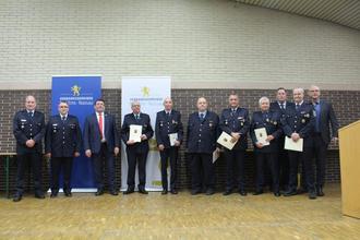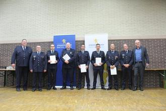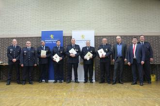 Zusammen mit Landrat Denninghoff überreichte er die Feuerwehr-Ehrenzeichen in Bronze und in Silber für 15-jährige bzw. 25-jährige aktive Tätigkeit, sowie Goldene Feuerwehr-Ehrenzeichen für 35-jährige und 45-jährige aktive Mitgliedschaft in der Feuerwehr.