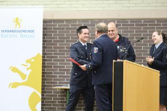 Nach den Grußworten von Landrat Jörg Denninghoff, Ortsbürgermeisterin Michele Wittler, dem Wehrführer der Einheit Geisig Thomas Wendling und dem stellvertretenden Brand- und Katastrophenschutzinspekteur Lars Ritscher, folgte der Jahresbericht des Wehrleiters Mark Horbach. Zu Beginn bat er die Anwesenden, sich für die Totenehrung von ihren Plätzen zu erheben. Insgesamt 550 Aktive, davon 58 Frauen leisten derzeit ihren aktiven Dienst in den 27 Feuerwehreinheiten der Verbandsgemeinde Bad Ems-Nassau. Weiterhin beleuchtete er die bisher 225 Alarmierungen, davon 213 Einsätze auf dem Gebiet der Verbandsgemeinde. Dazu zählten 78 Hilfeleistungseinsätze, 109 Brandeinsätze, 5 Einsätze mit Gefahrgut, 16 Sonderein- sätze, hierzu zählen beispielsweise Personensuchen, 4 Unwettereinsätze und 1 Einsatz auf dem Wasser. Weiterhin war die Feuerwehr bei 6 Brandsicherheitswachen gefragt.