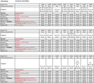 | • | Abschnitt Nassau (Lahn) - Koblenz Hauptbahnhof: Die Ersatzbusse (mit Anschluss von und auf die Regionalbahnlinie RB 23 in Nassau) fahren ab dem Bahnhof Nassau mit Halt in Dausenau (Lahnstraße 3 Hotel Lahnhof), Bad Ems (Hauptbahnhof, Bahnhofstraße), Bad Ems West (Ernst-Born-Straße), Fachbach (Koblenzer Straße 74 - Nieverner Brücke) als Ersatz für Bahnhof Nievern, Bad Ems (Haltestelle „Arenberger Straße“) in der Koblenzer Straße 82 und dann über die B 261 und B49 direkt ohne weiteren Zwischenhalt zum Koblenzer Hauptbahnhof. Zurück fahren die Busse in umgekehrter Richtung. |