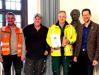 Der Nassauer Bauhofmitarbeiter Torsten Wittgen (zweiter von rechts) wurde in einer kleinen Feierstunde von Stadtbürgermeister Manuel Liguori (rechts) und im Beisein von Bauhofleiter Ben Mathy (zweiter von links), sowie dem Personalrat-Vorsitzenden Ralf Becker (links), im Rathauses mit Urkunde und Geschenk geehrt.